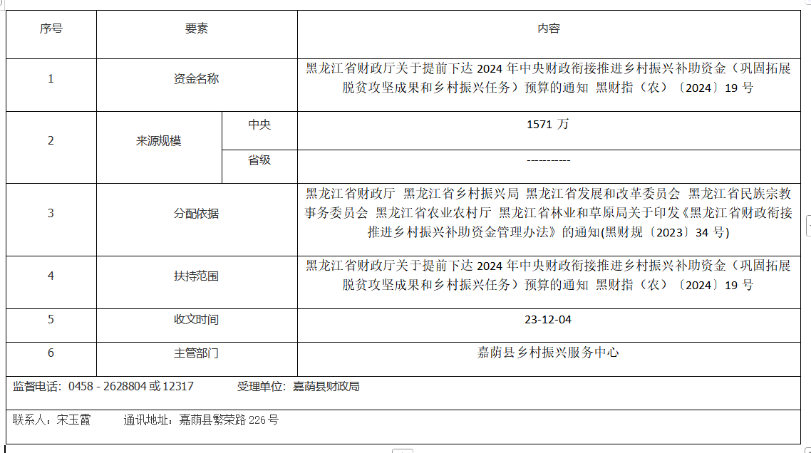 黑龙江省财政厅关于提前下达2024年中央财政衔接推进乡村振兴补助资金(巩固拓展脱贫攻坚成果和乡村振兴任务)预算的通知 黑财指(农)【2024】19号