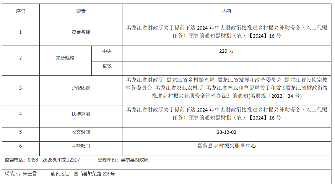黑龙江省财政厅关于提前下达2024年中央财政衔接推进乡村振兴补助资金(以工代赈任务)预算的通知黑财指(农)【2024】16号