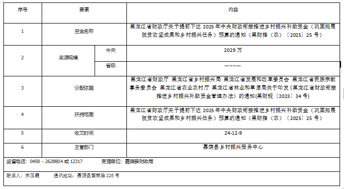黑龙江省财政厅关于提前下达2025年中央财政衔接推进乡村振兴补助资金(巩固拓展脱贫攻坚成果和乡村振兴任务)预算的通知-黑财指(农)〔2025〕25号