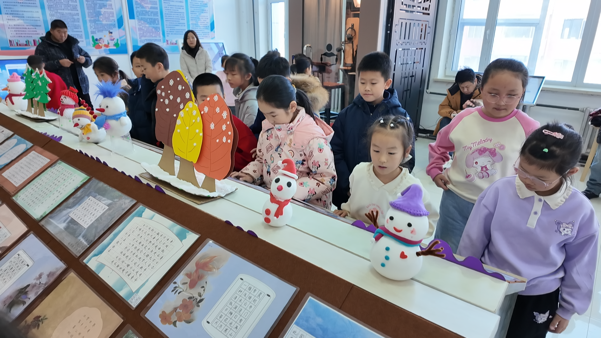 展区内,一幅幅钢笔字作品整齐陈列,孩子们用稚嫩笔触写下对冰雪的喜爱与对家乡的赞美。大家在作品前缓缓驻足,轻声读出文字内容,有的手指轻触展架边缘逐字浏览,有的侧身与同伴并肩观察,不时微微点头,或抬手比划书写笔画,目光始终聚焦于展陈的作品之上,眼神里满是对优秀作品的欣赏与向往。