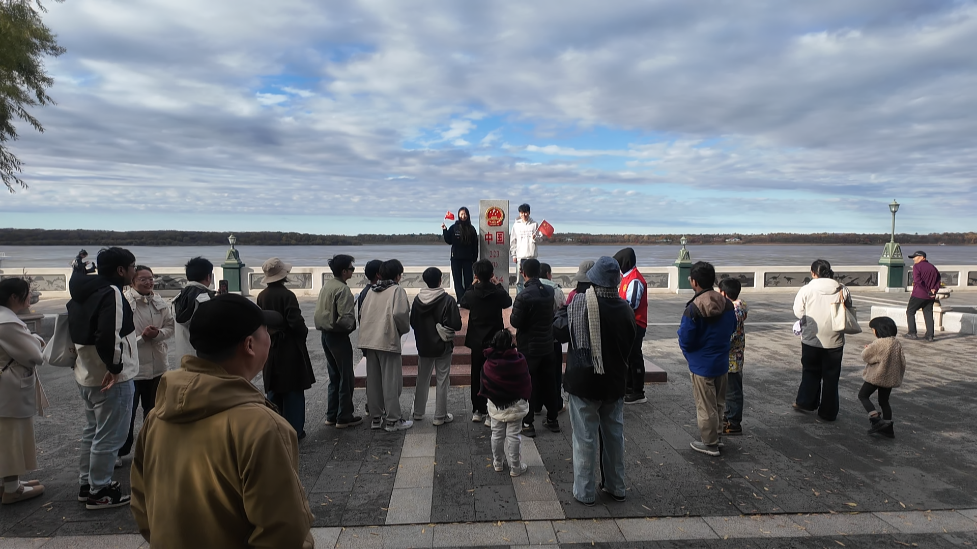 国庆中秋假期,嘉荫县的界江界碑前,早已排起了打卡的长队。这支由不同年龄、不同地域游客组成的队伍,手中挥舞着小国旗,脸上洋溢着激动的神情。在打卡现场,游客们手里举着迷你国旗,紧贴着界碑站立,身后是缓缓流淌的黑龙江,对岸的俄罗斯风光隐约可见。年轻游客以界碑为背景录制短视频;老年游客手抚界碑上的“中国”字样轻声感慨;亲子家庭则把“我爱中国”的贴纸贴在衣服上,与界碑合影留念。
