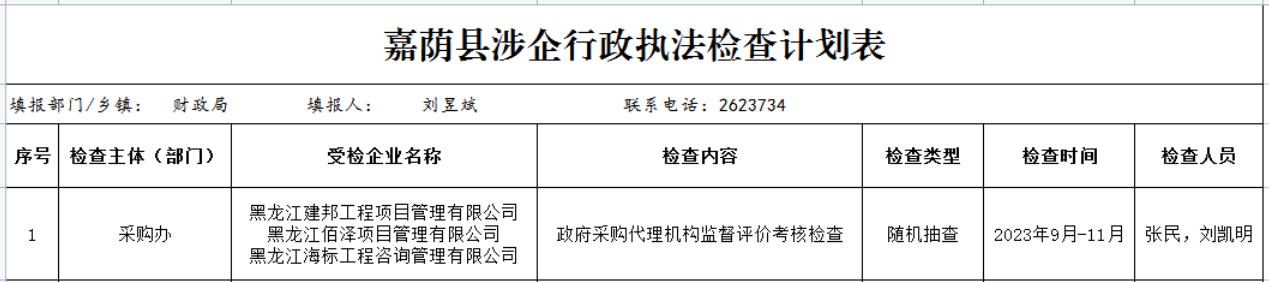 嘉荫县涉企行政执法检查计划表