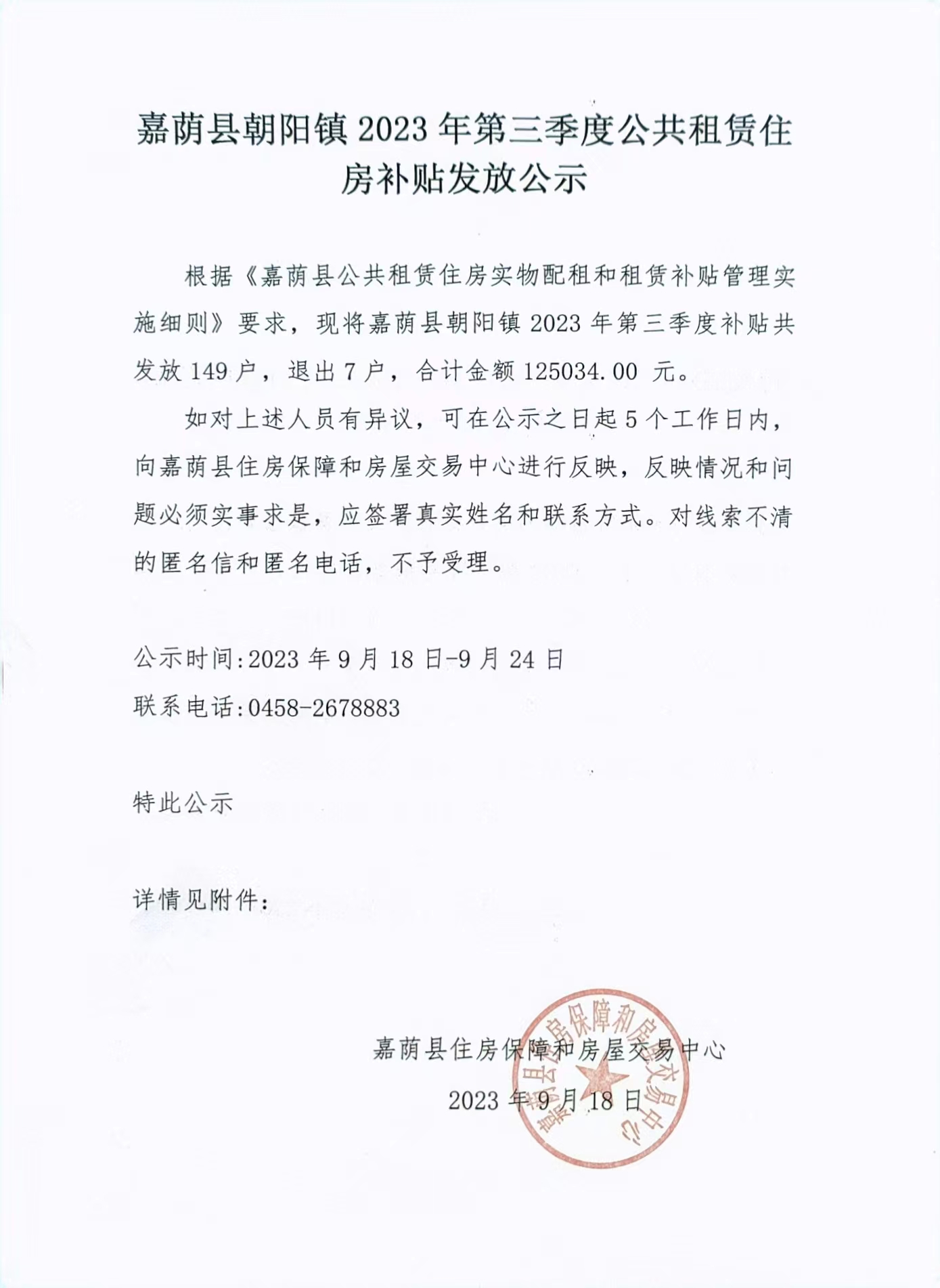 嘉荫县朝阳镇2023年第三季度公共租赁住房补贴发放公示