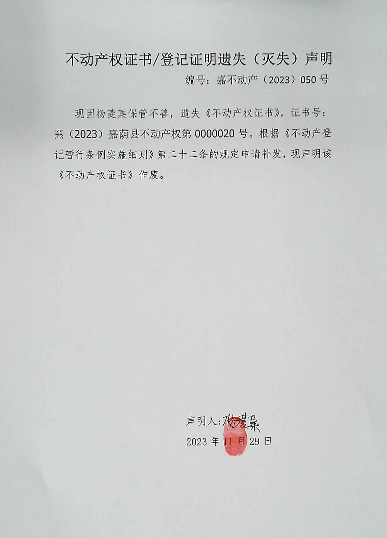 不动产权证书/登记证明遗失声明 (2023)050号
