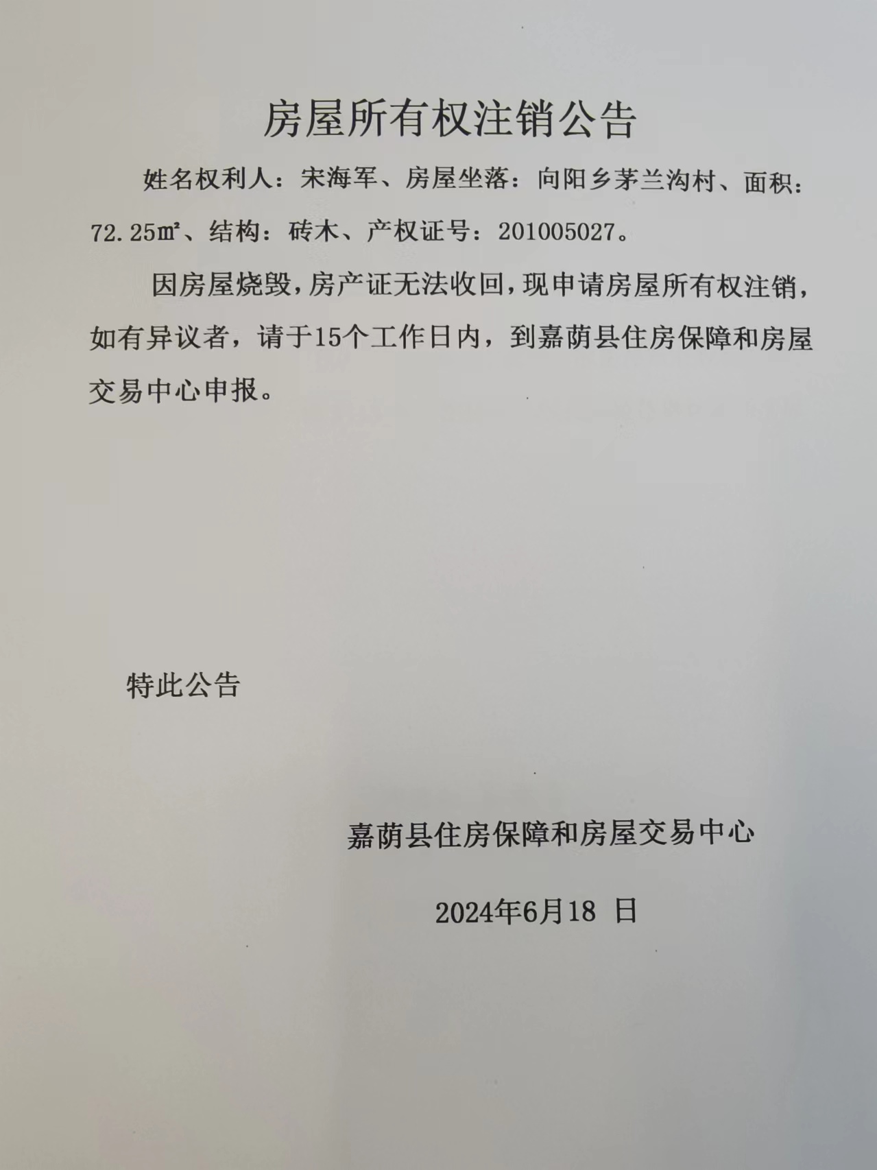 房屋所有权注销公告