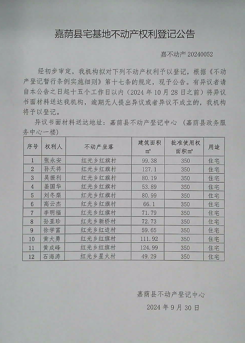 嘉荫县宅基地不动产权利登记公告 嘉不动产20240052