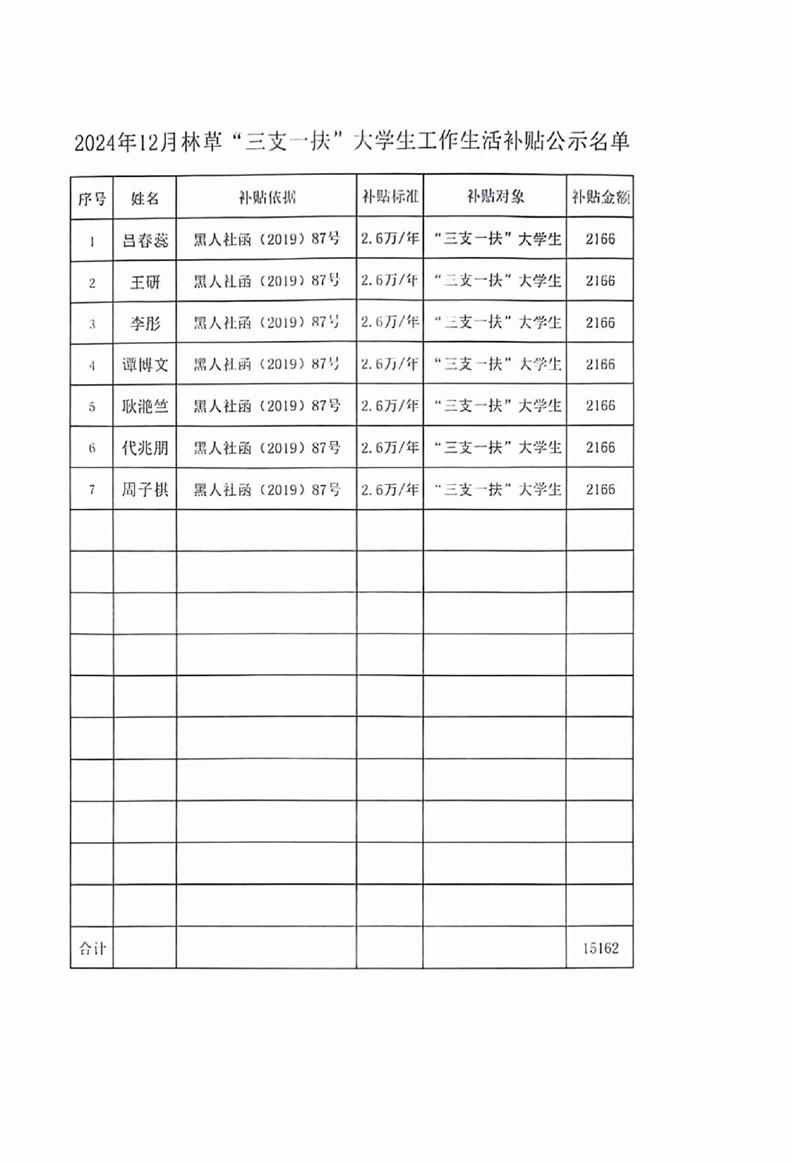 2024年12月林草“三支一扶”大学生工作生活补贴公示名单