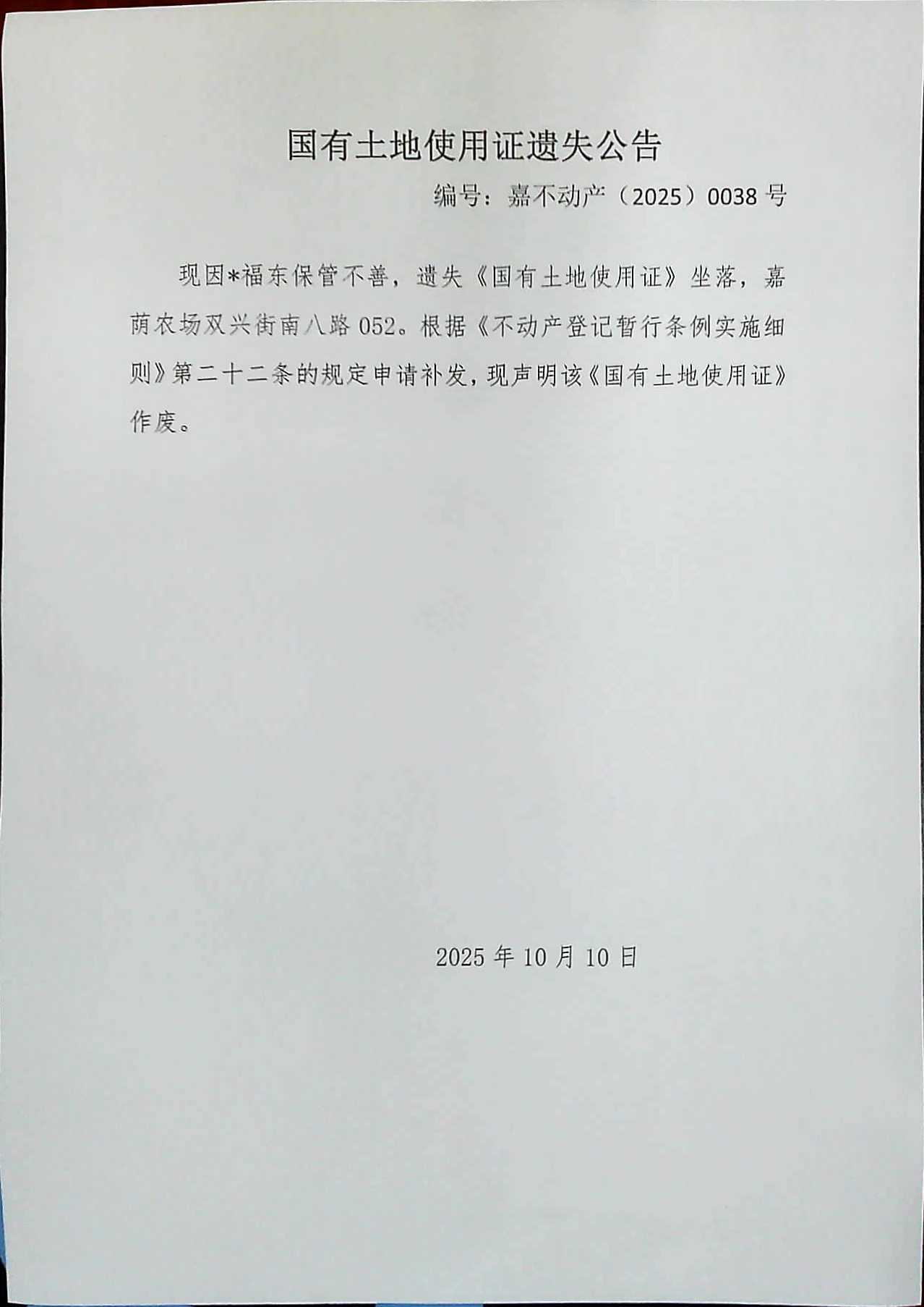 国有土地使用证遗失公告 嘉不动产(2025)0038号