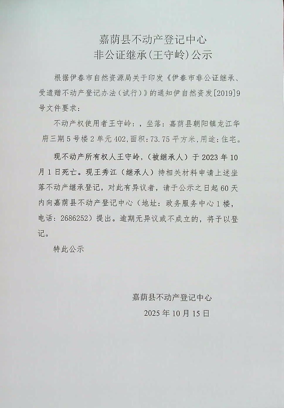 嘉荫县不动产登记中心非公证继承(王守岭)公示