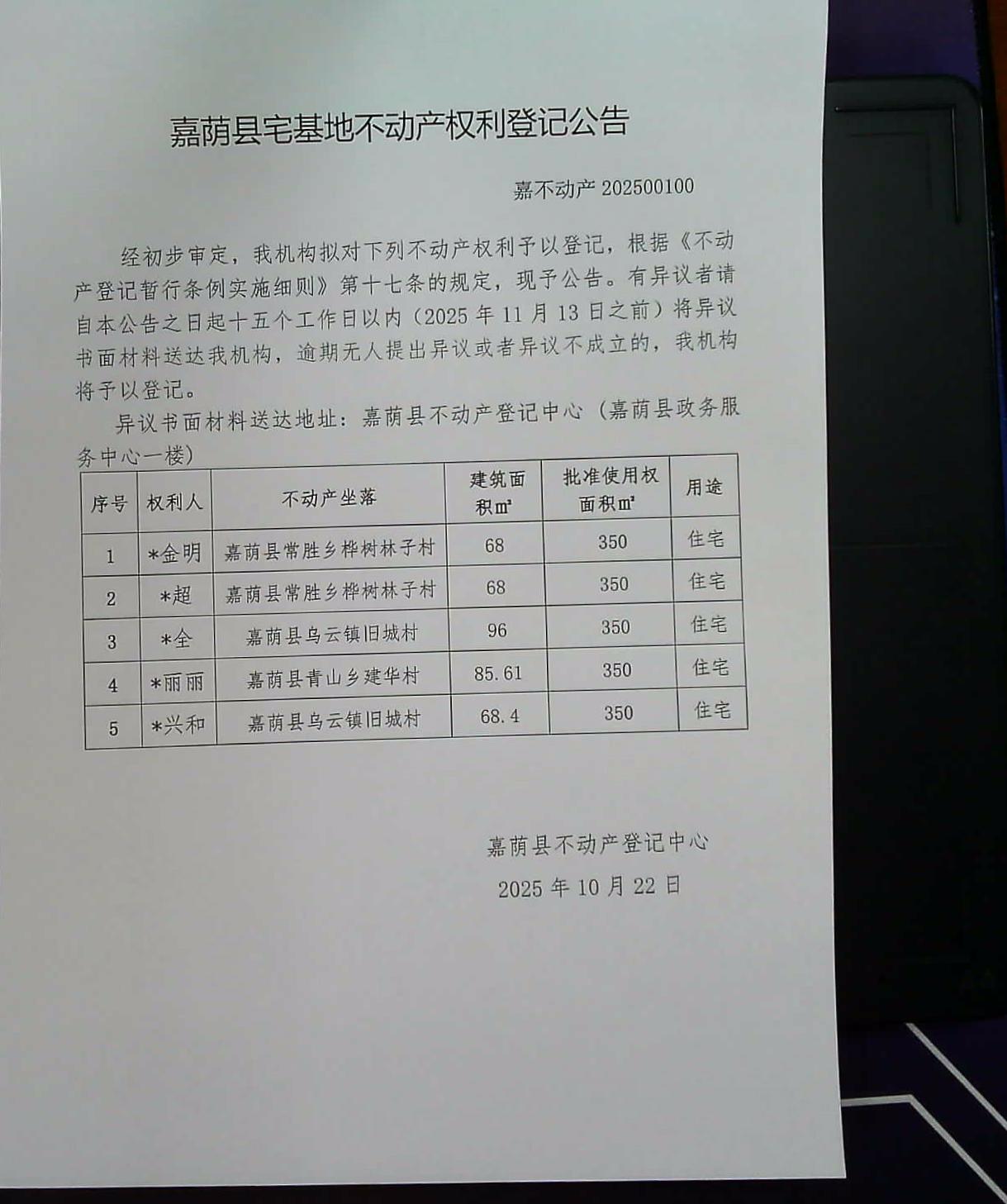 嘉荫县宅基地不动产权利登记公告 嘉不动产202500100