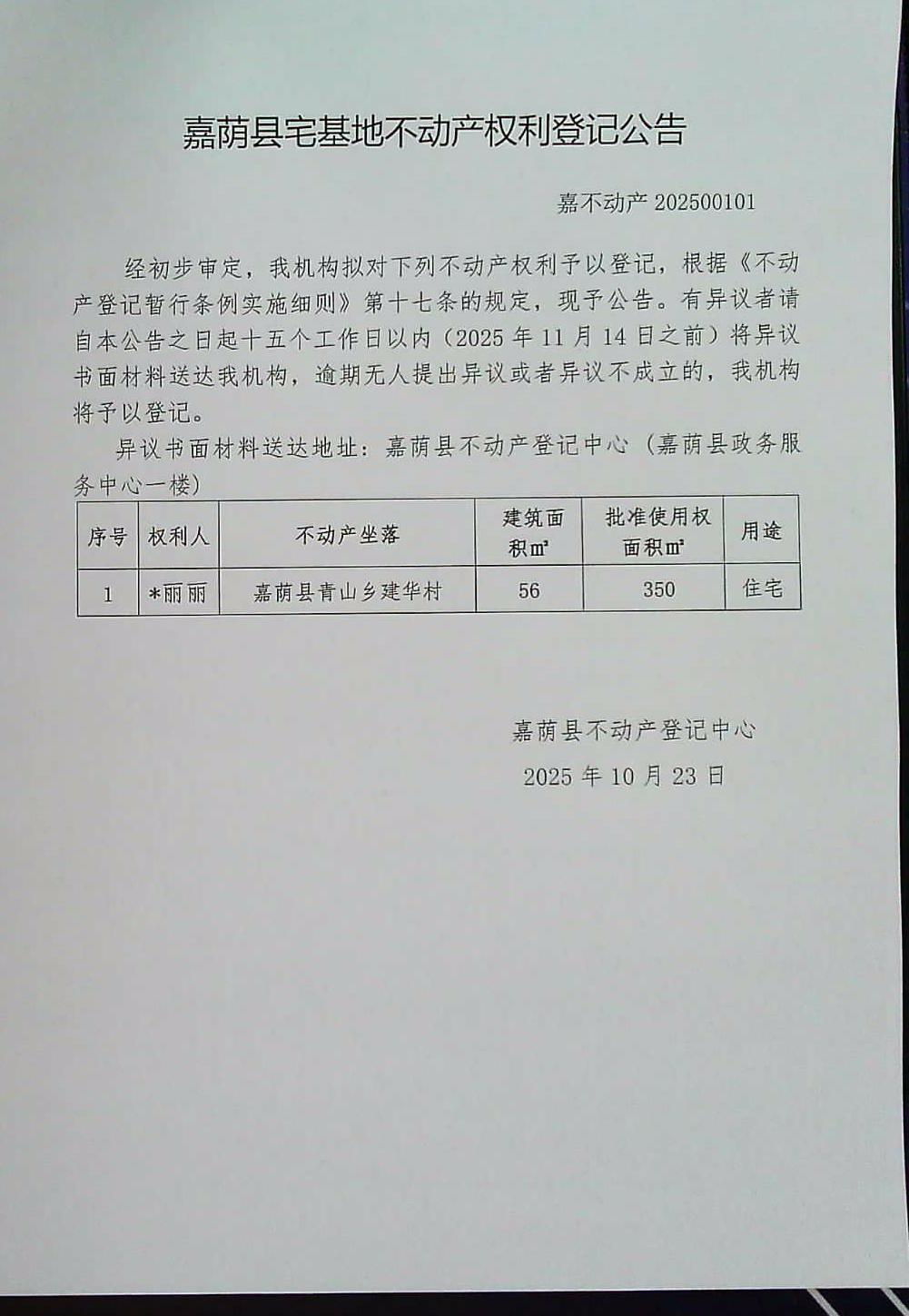 嘉荫县宅基地不动产权利登记公告 嘉不动产202500101