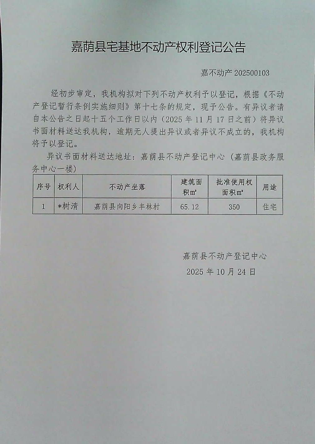 嘉荫县宅基地不动产权利登记公告 嘉不动产202500103