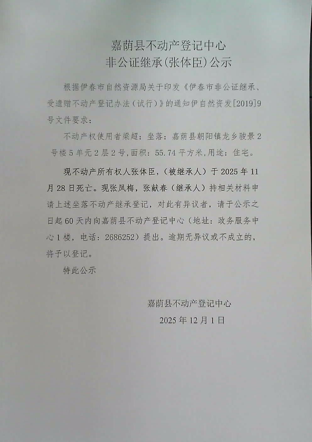 嘉荫县不动产登记中心非公证继承(张体臣)公示
