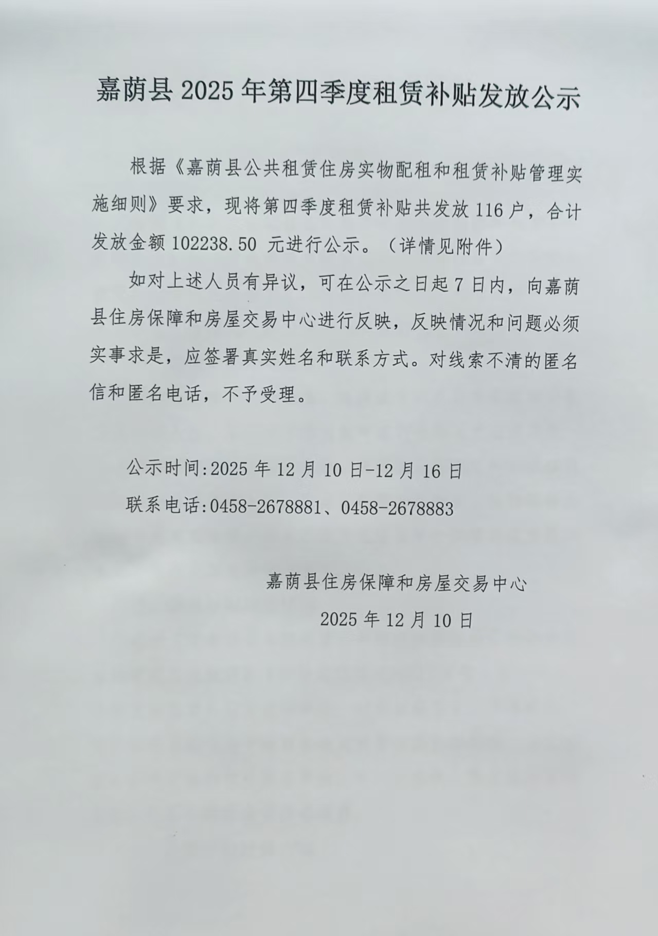 嘉荫县2025年第四季度租赁补贴发放公示
