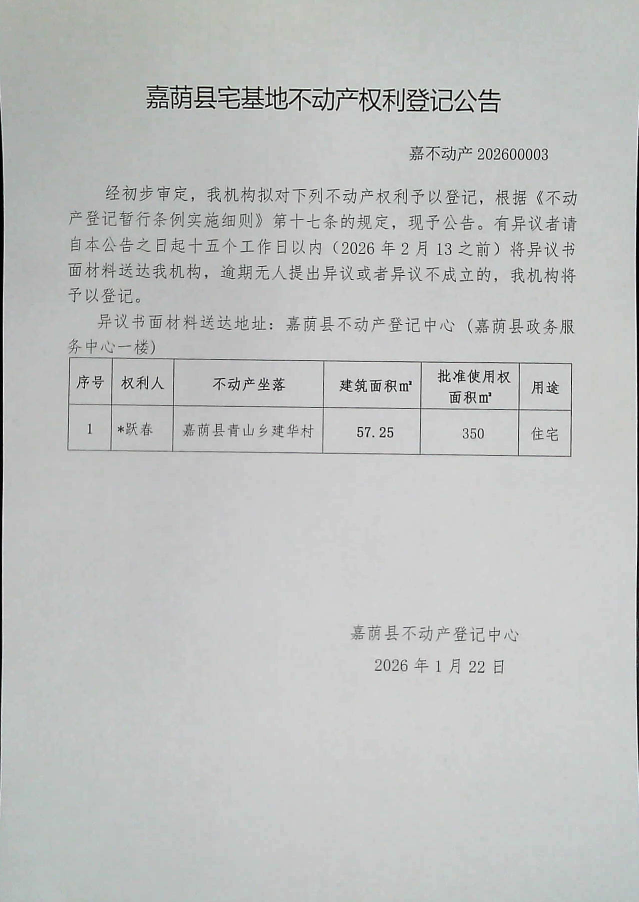 嘉荫县宅基地不动产权利登记公告 嘉不动产202600003