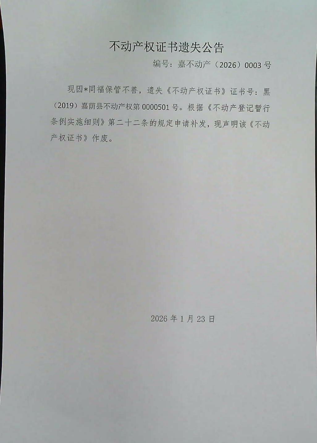 不动产权证书遗失公告 嘉不动产(2026)0003号