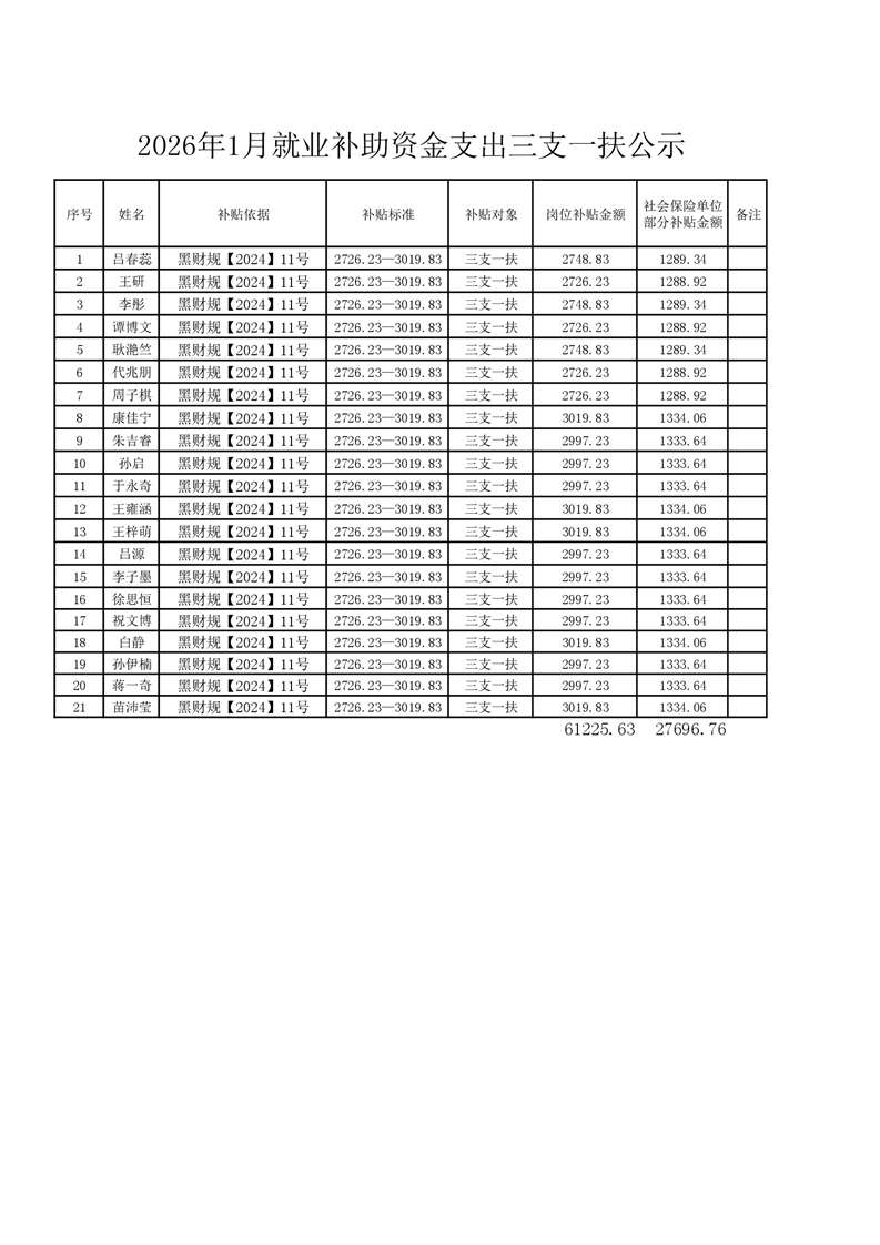 1月就业三支一扶公示