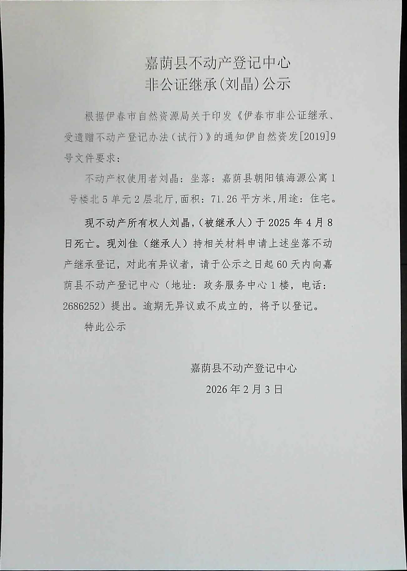 嘉荫县不动产登记中心非公正继承(刘晶)公示