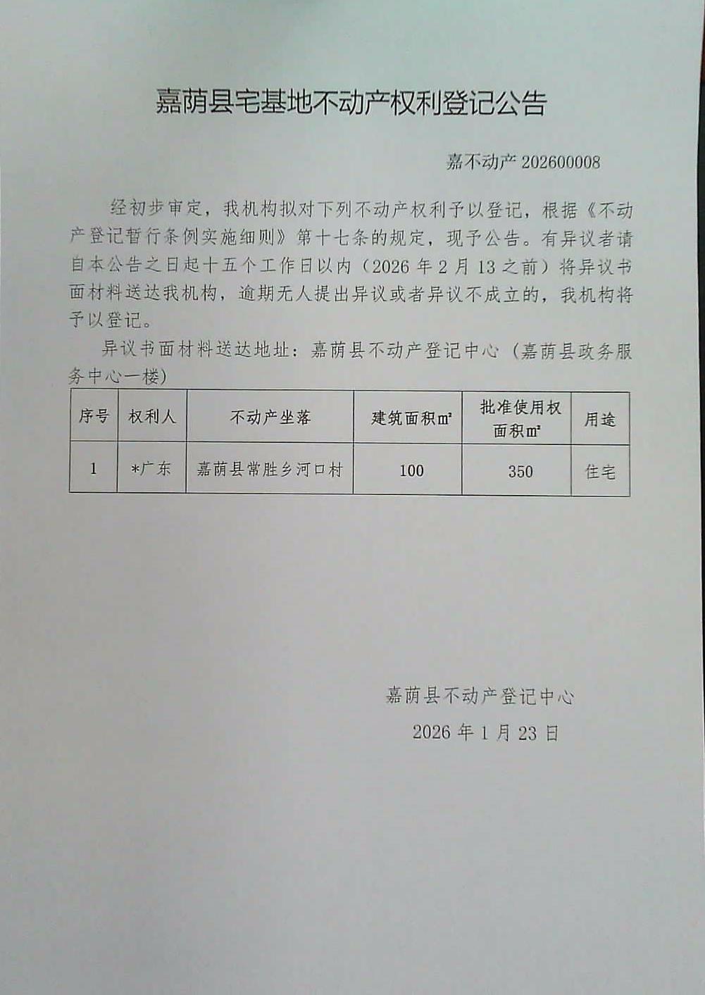 嘉荫县宅基地不动产权利登记公告 嘉不动产202600008