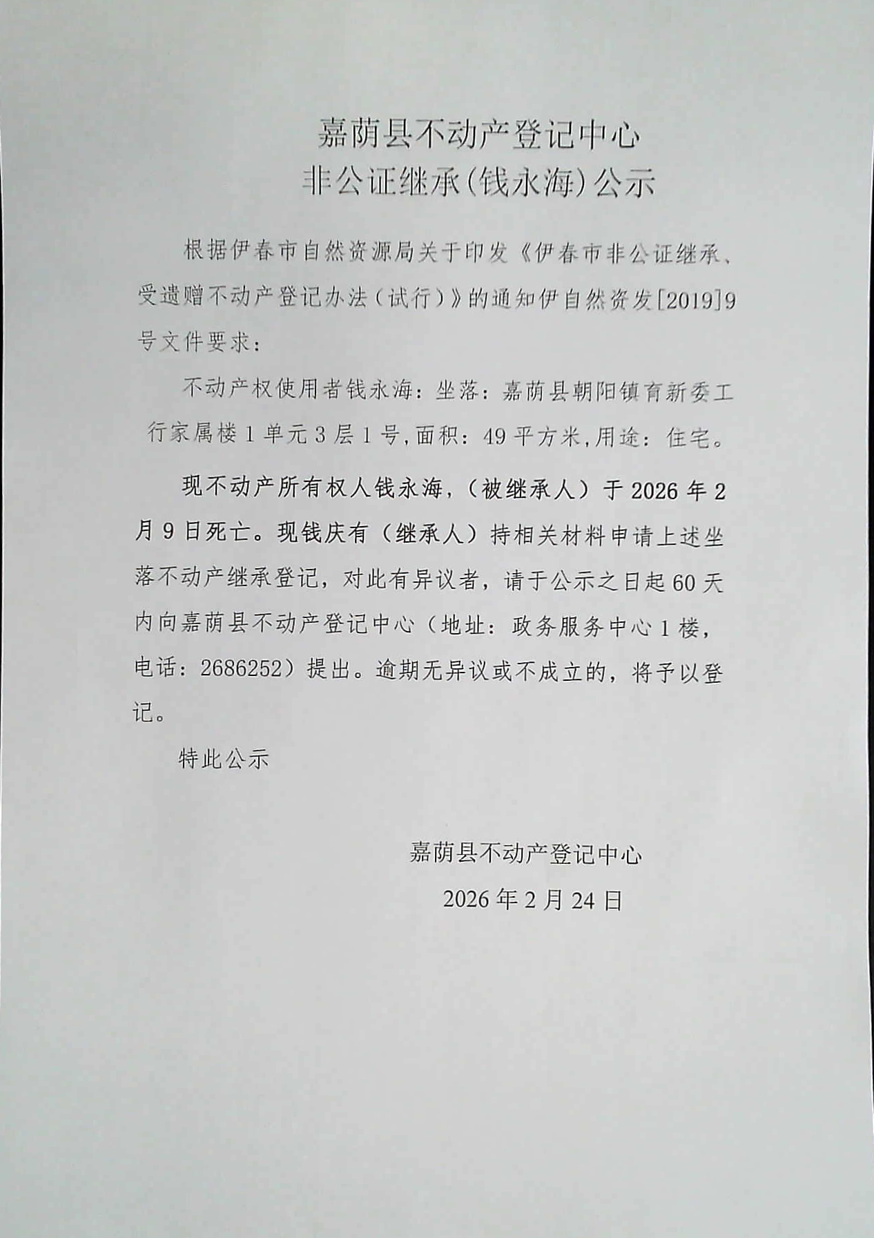 嘉荫县不动产登记中心非公证继承(钱永海)公示