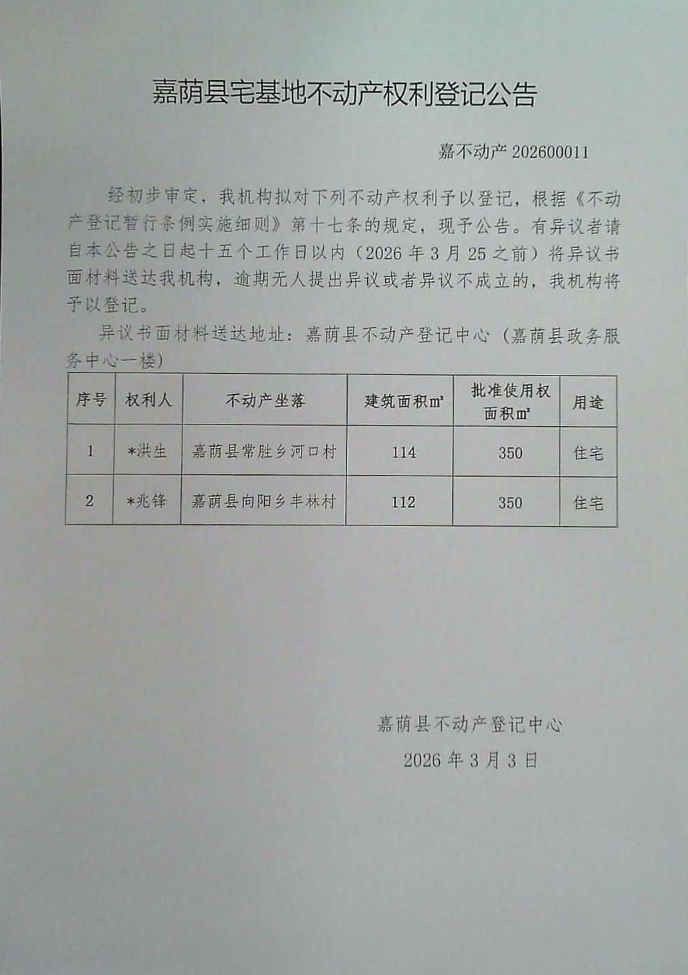 嘉荫县宅基地不动产权利登记公告 嘉不动产202600011