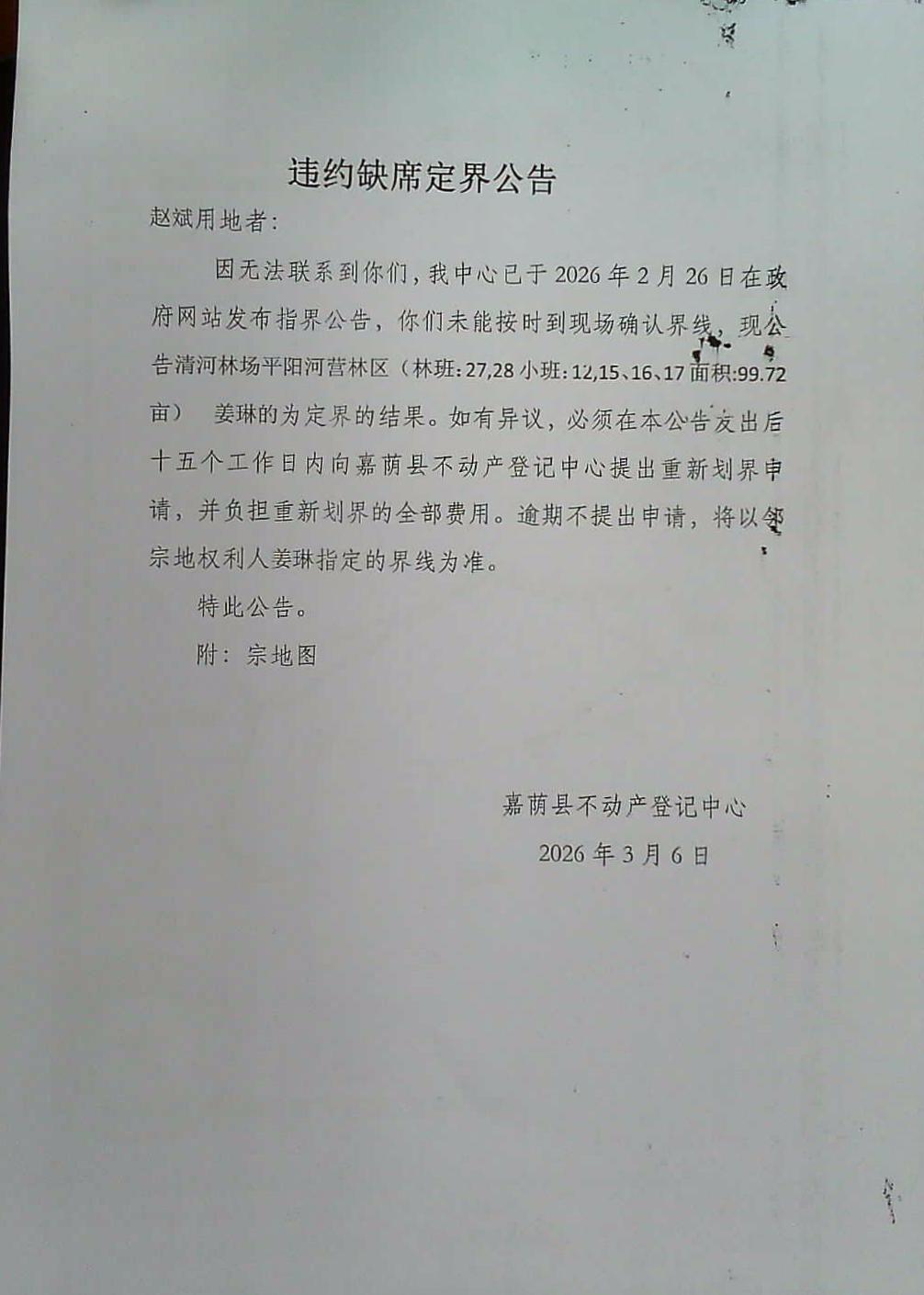 违约缺席定界公告