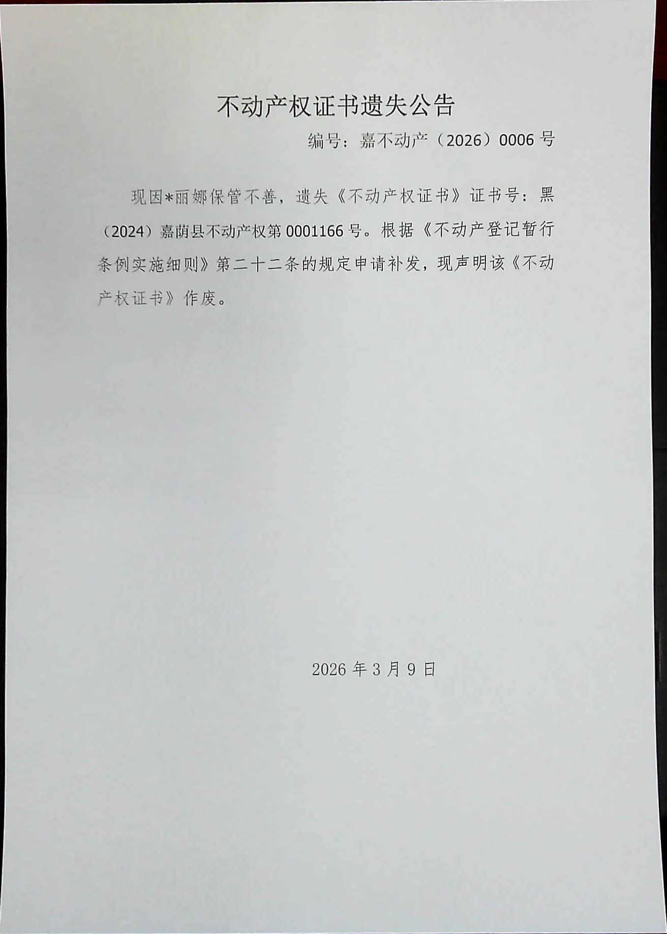 不动产权证书遗失公告 嘉不动产(2026)0006号