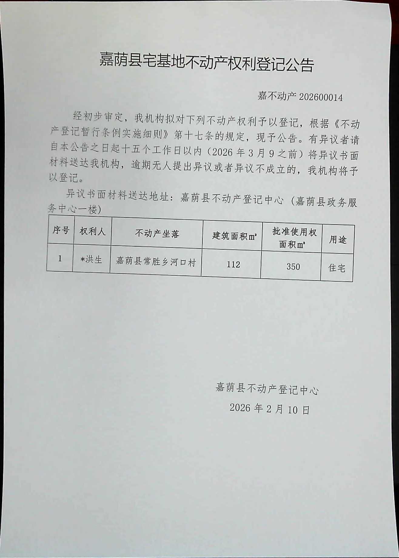 嘉荫县宅基地不动产权利登记公告 嘉不动产202600014