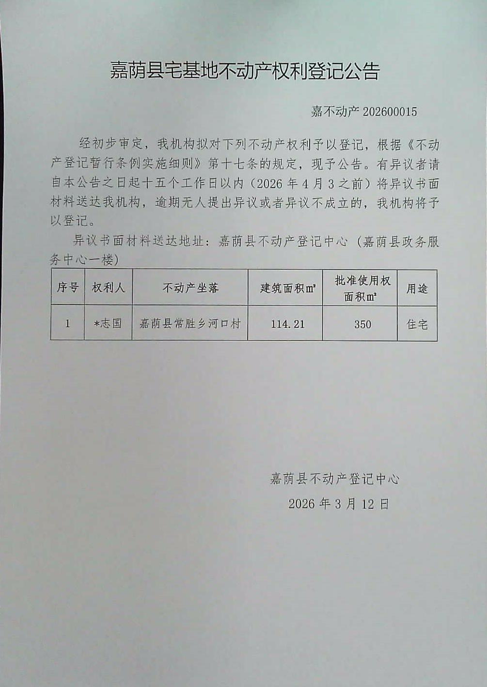 嘉荫县宅基地不动产权利登记公告 嘉不动产202600015