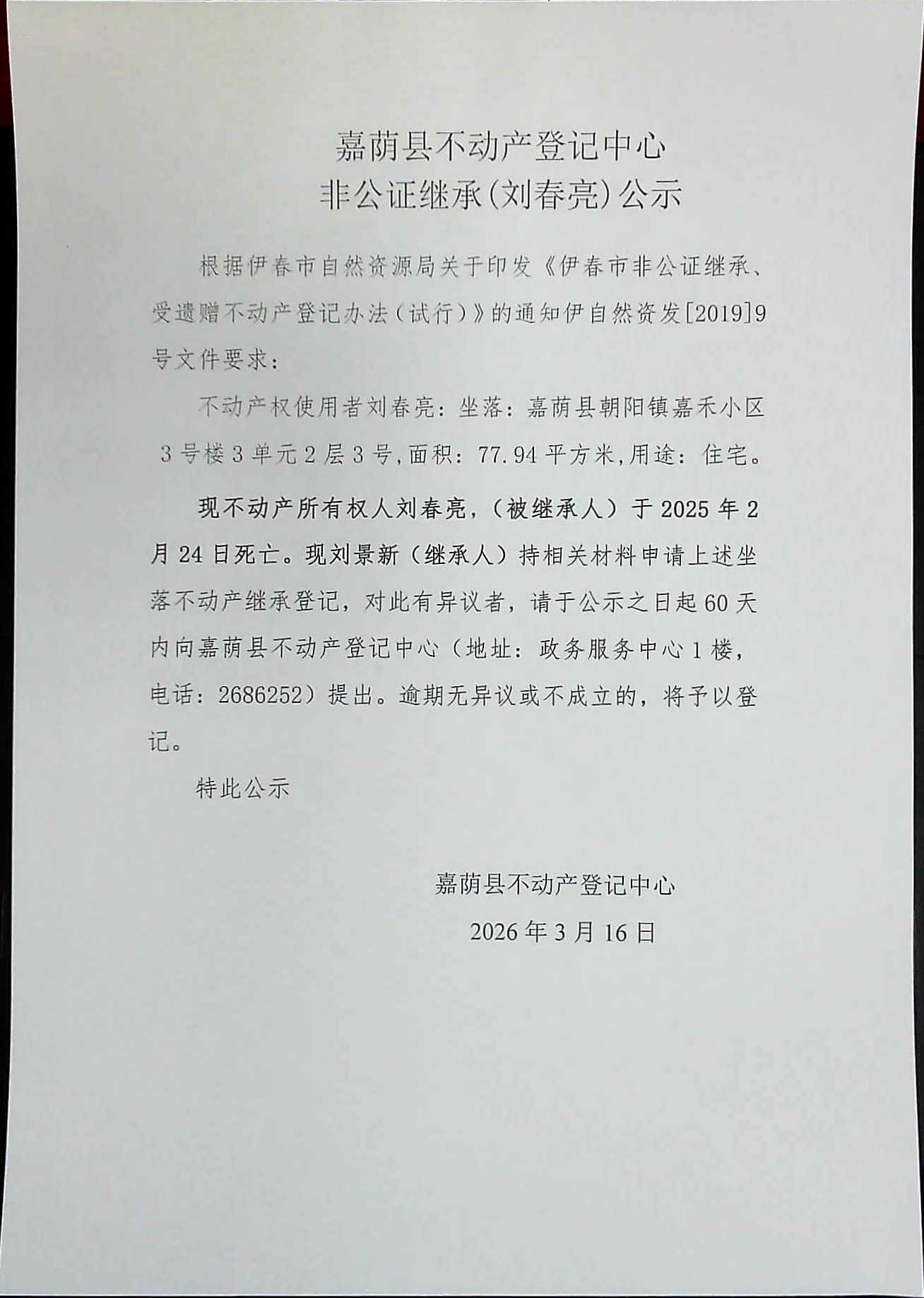 嘉荫县不动产登记中心非公正继承(刘春亮)公示