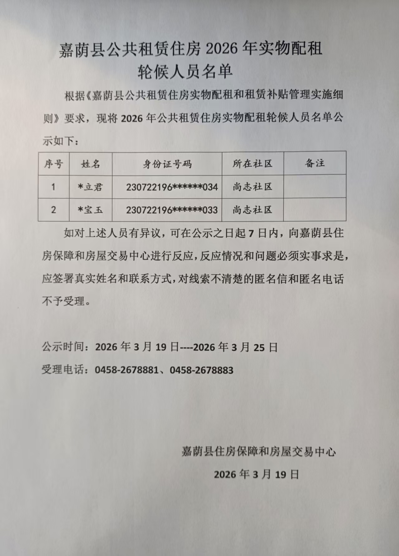 嘉荫县公共租赁住房2026年实物配租轮候人员名单