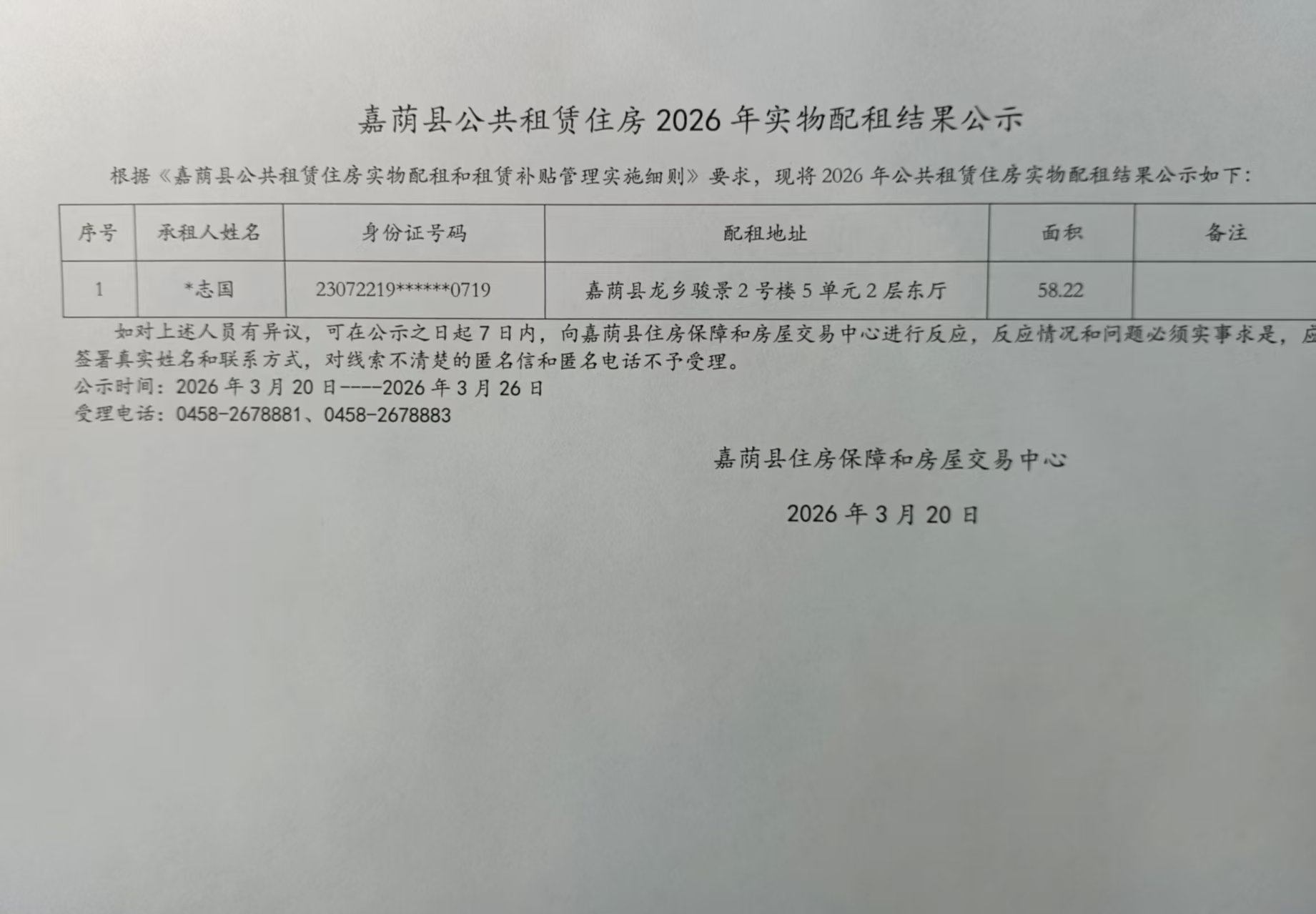 嘉荫县公共租赁住房2026年实物配租结果公示