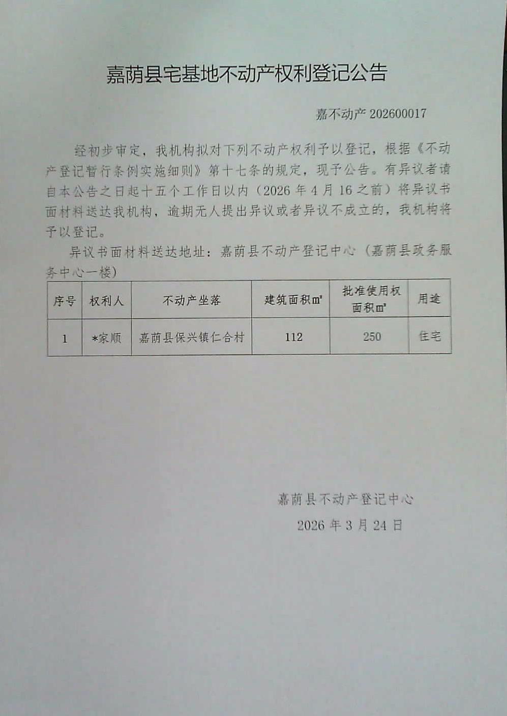 嘉荫县宅基地不动产权利登记公告 嘉不动产202600017