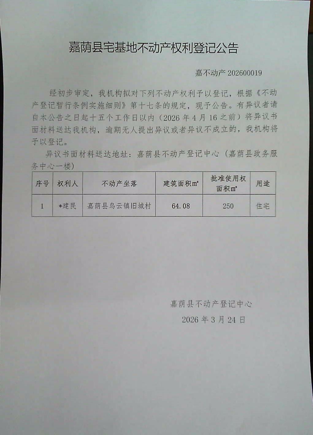 嘉荫县宅基地不动产权利登记公告 嘉不动产202600019