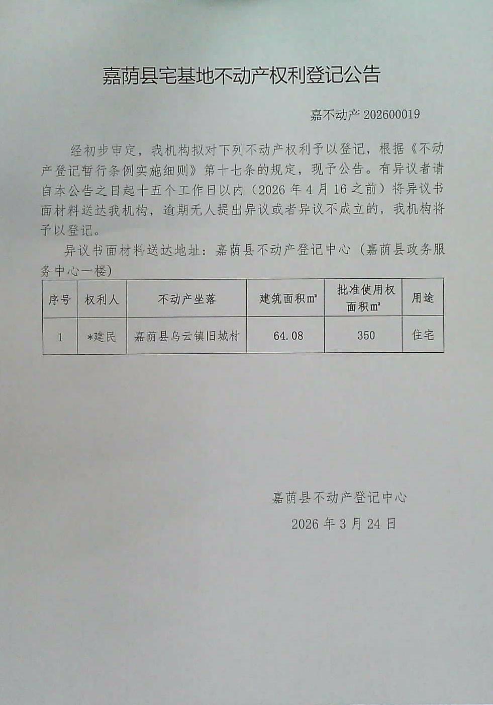 嘉荫县宅基地不动产权利登记公告 嘉不动产202600019