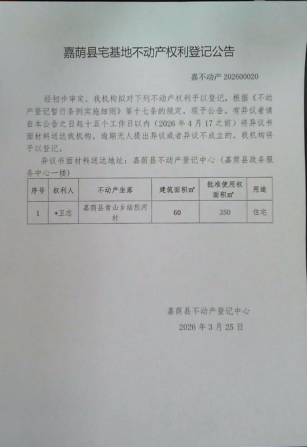 嘉荫县宅基地不动产权利登记公告 嘉不动产202600020