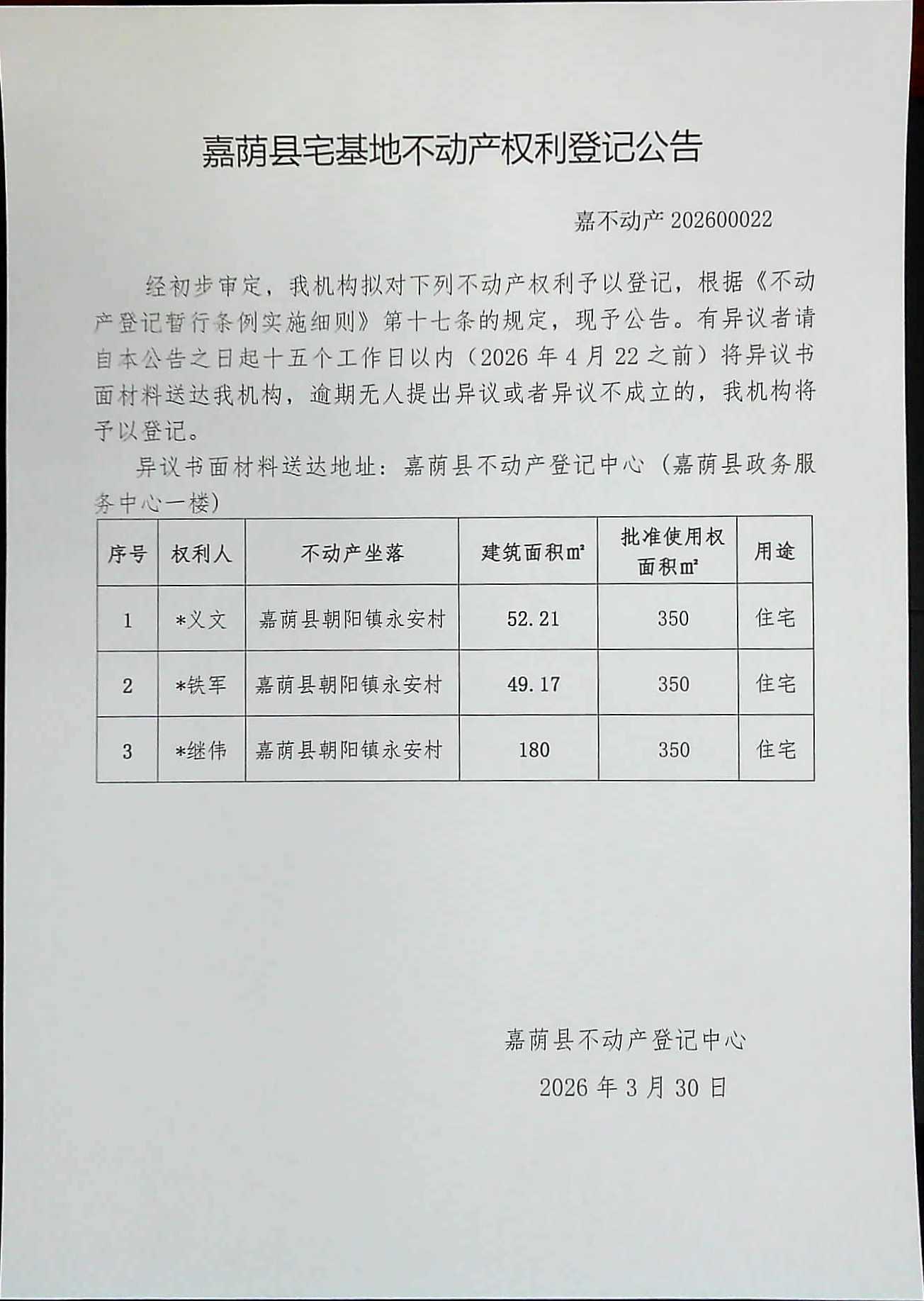 嘉荫县宅基地不动产权利登记公告 嘉不动产202600022