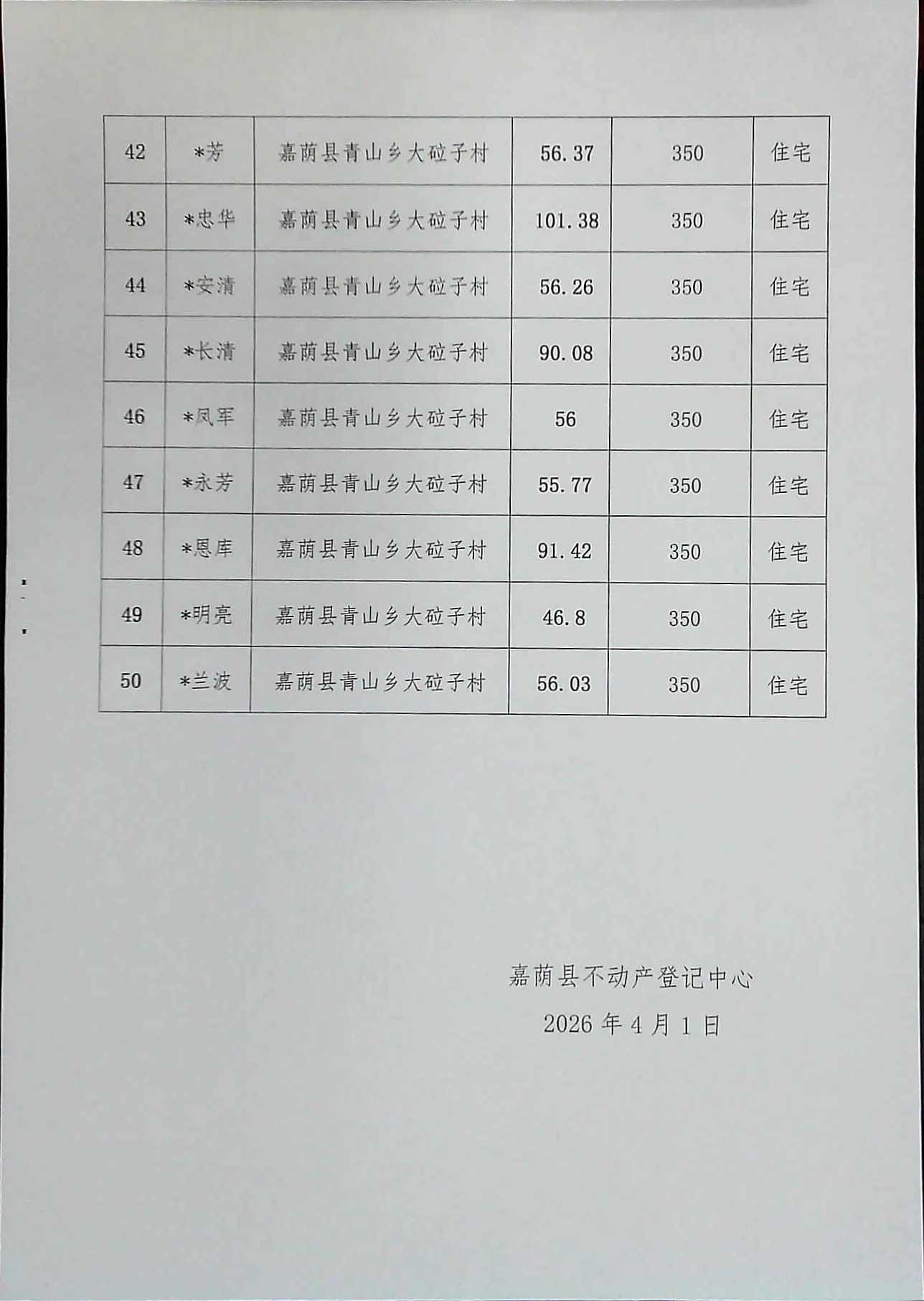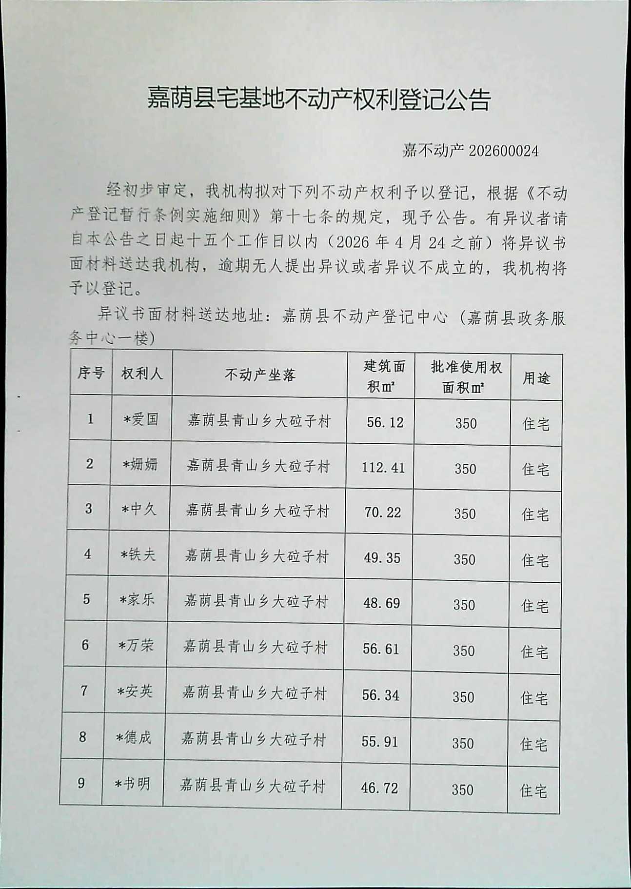 嘉荫县宅基地不动产权利登记公告 嘉不动产202600024