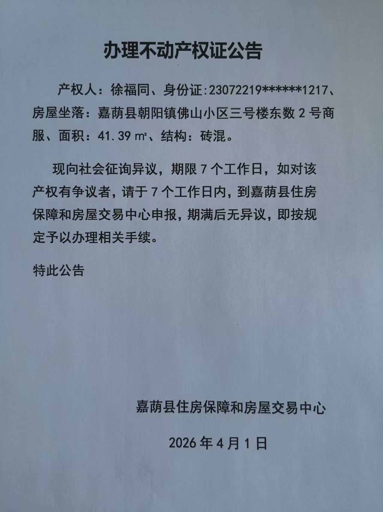 办理不动产权证公告