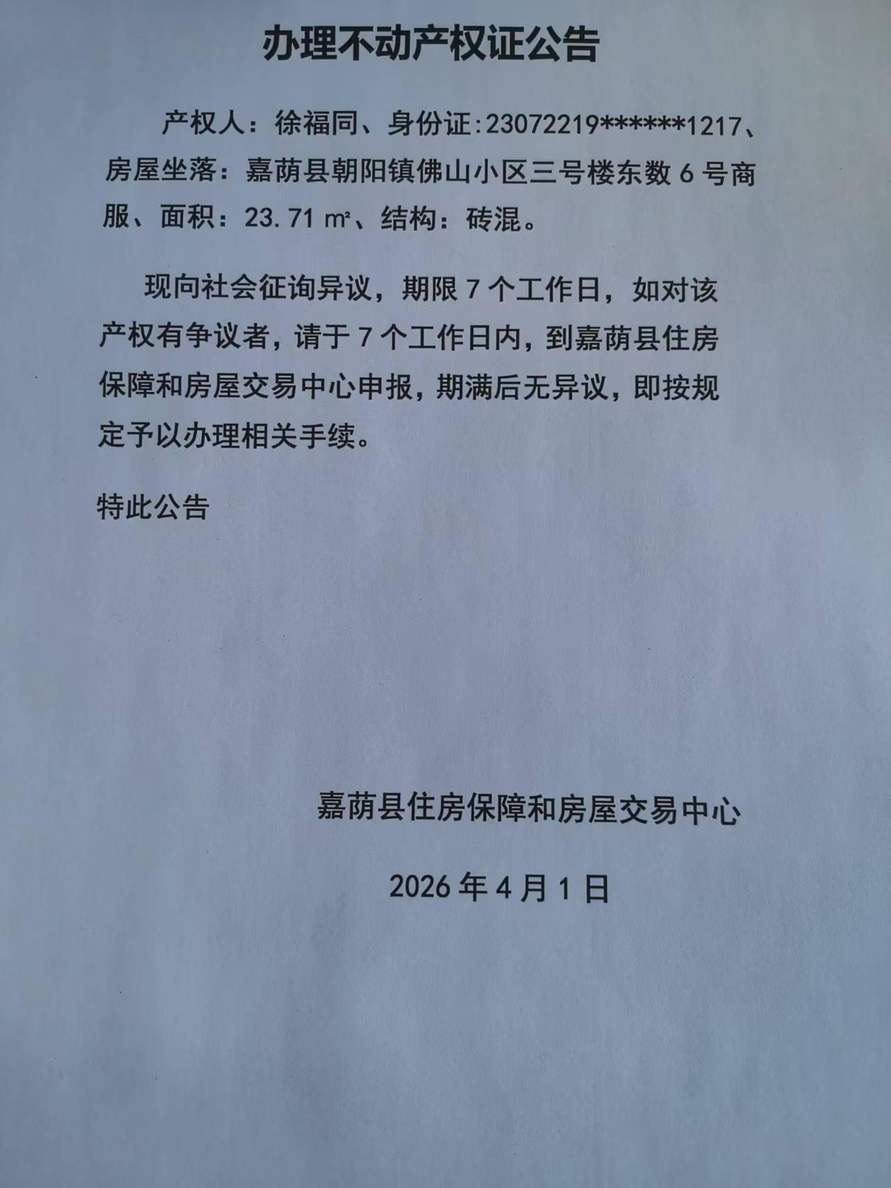 办理不动产权证公告