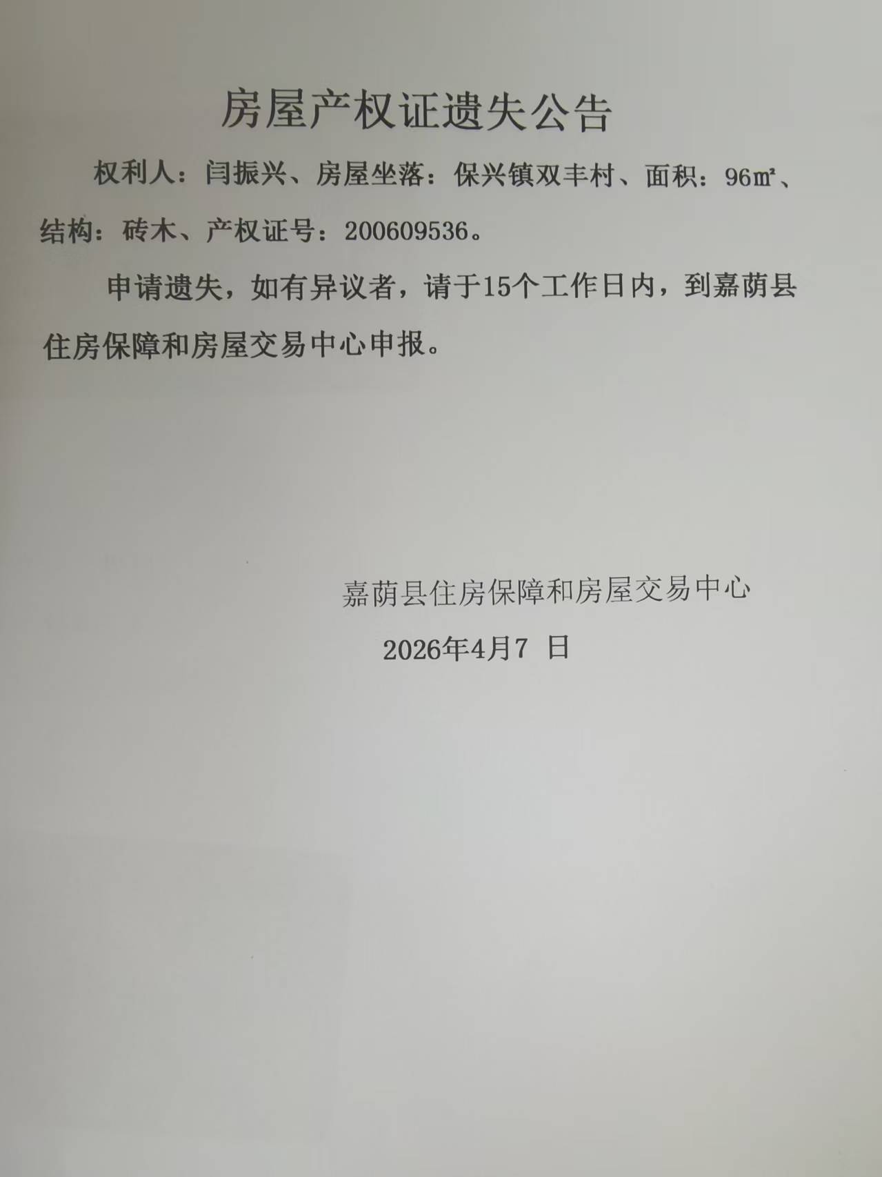 房屋产权证遗失公告