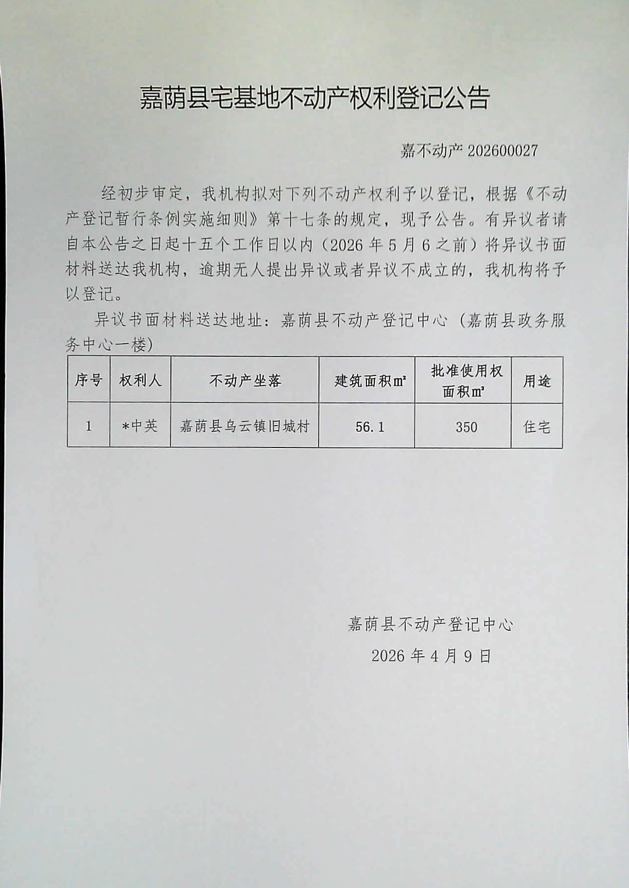 嘉荫县宅基地不动产权利登记公告 嘉不动产202600027