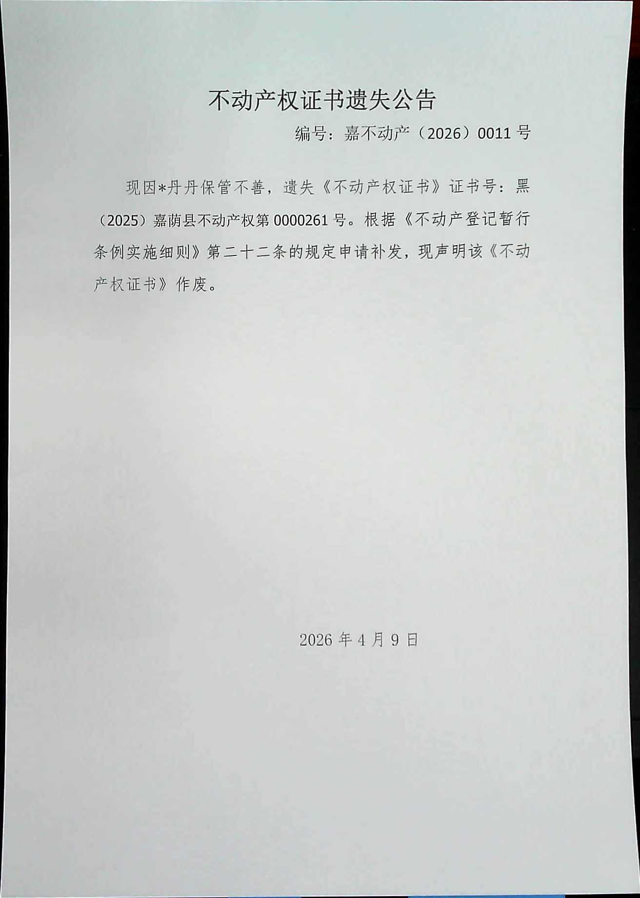 不动产权证书遗失公告 嘉不动产(2026)0011号