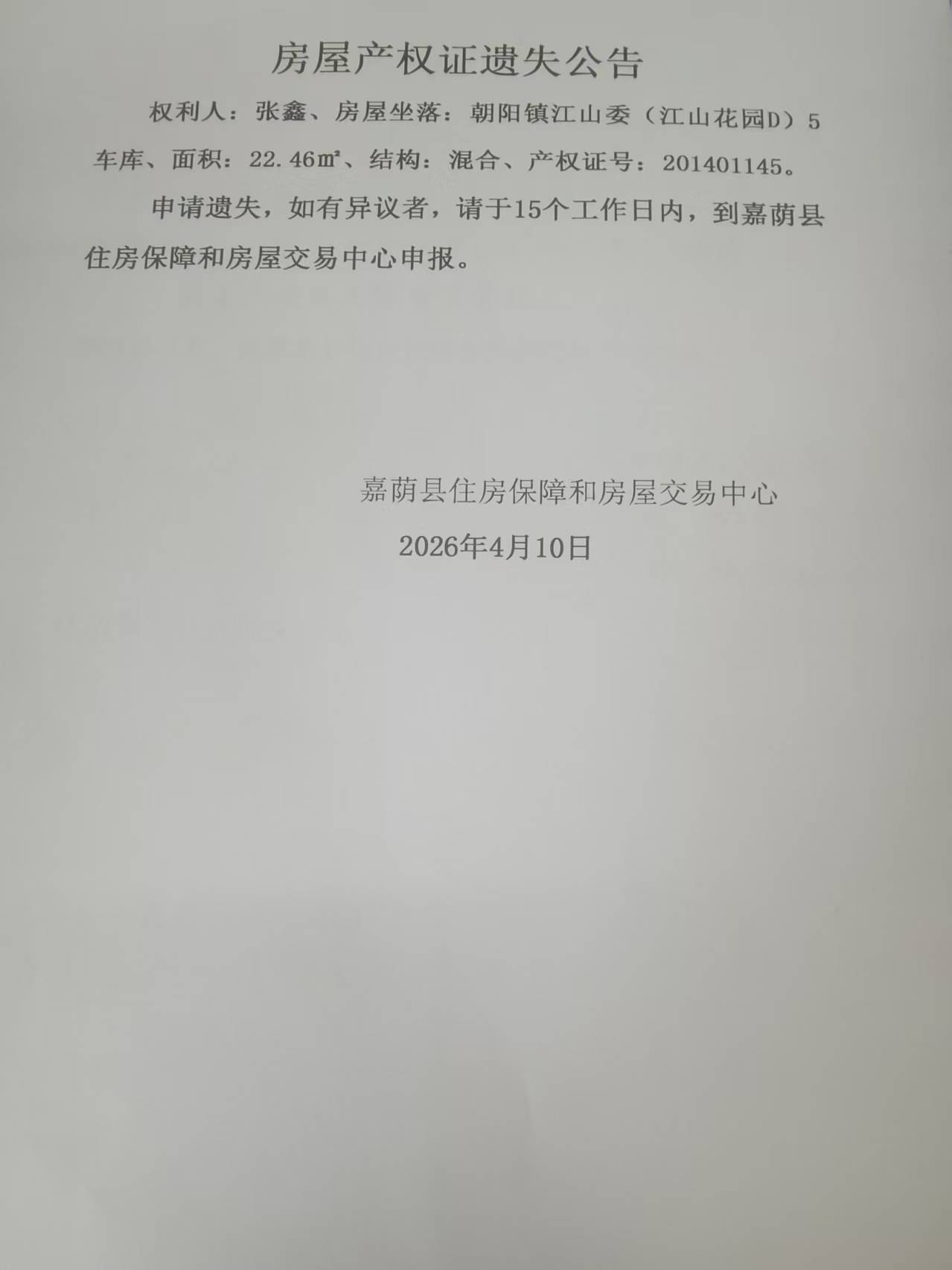 房屋产权证遗失公告