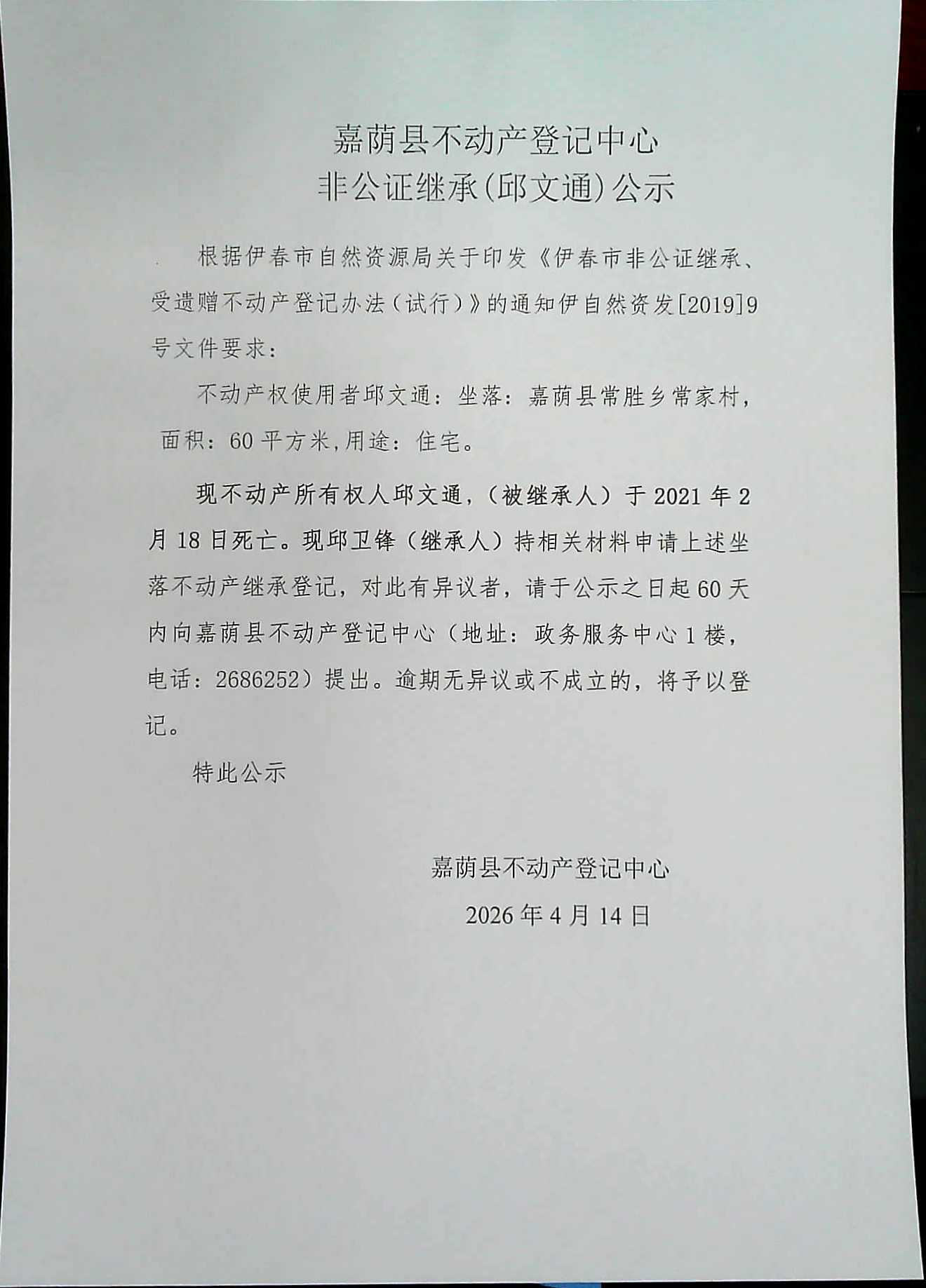 嘉荫县不动产登记中心非公正继承(邱文通)公示