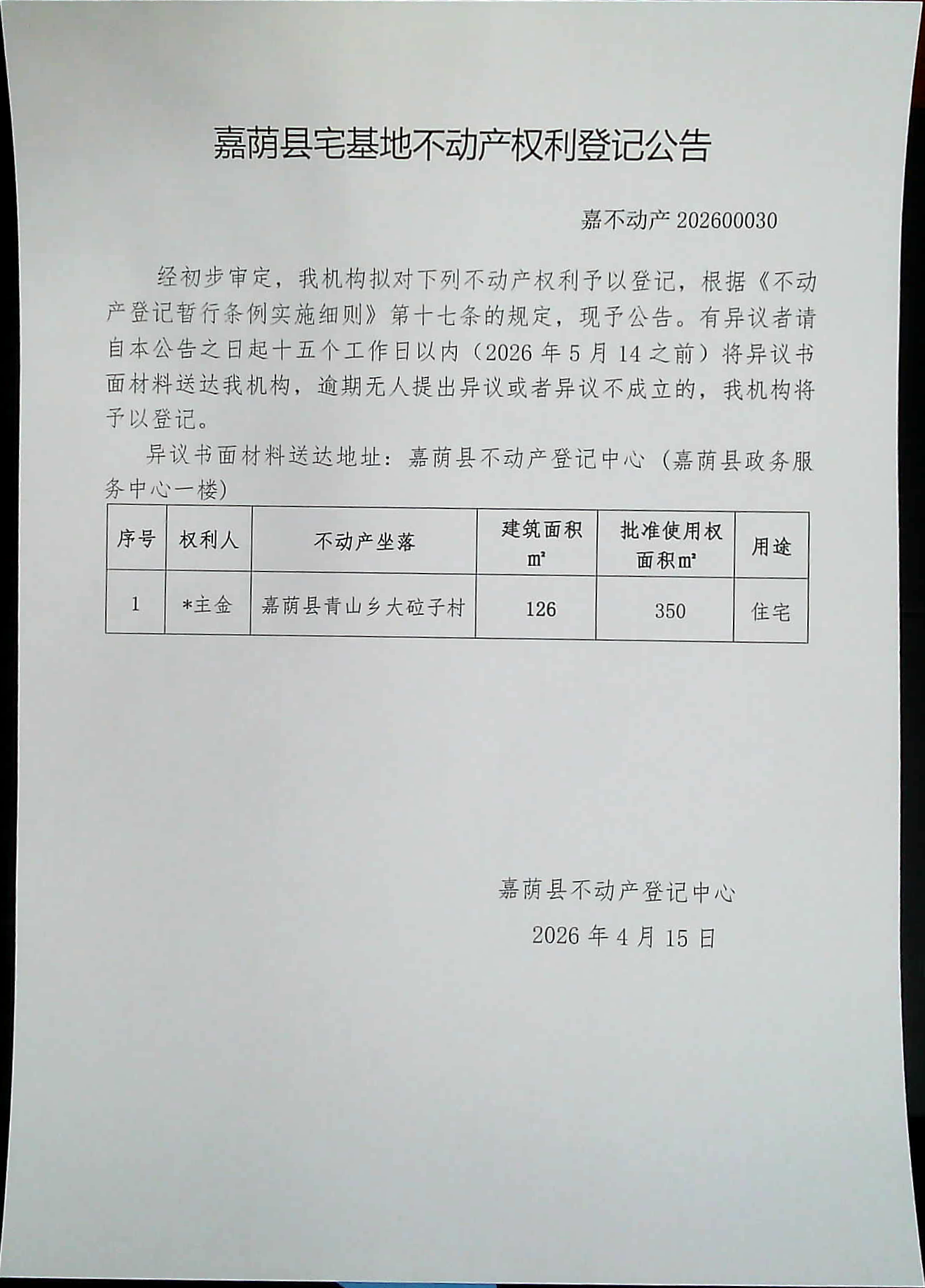 嘉荫县宅基地不动产权利登记公告 嘉不动产202600030
