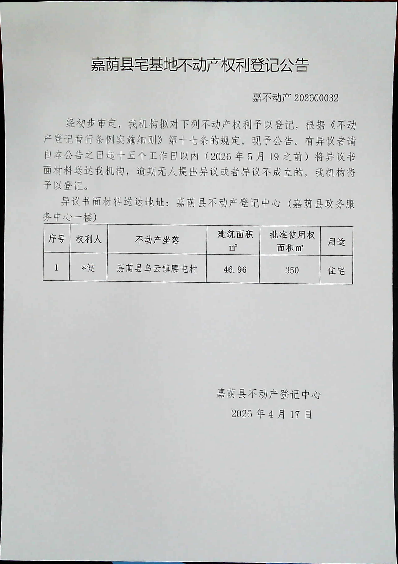 嘉荫县宅基地不动产权利登记公告 嘉不动产202600032
