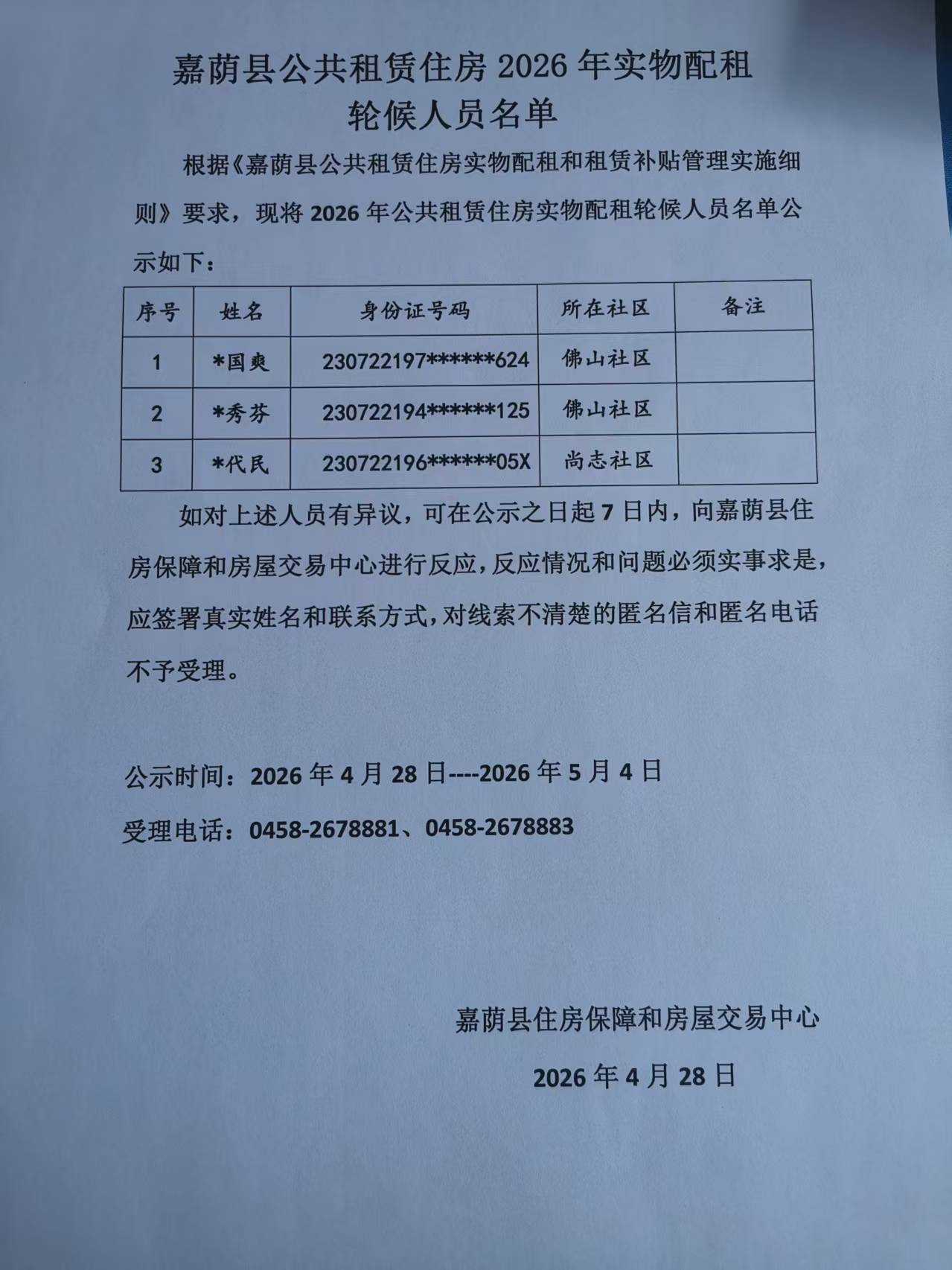嘉荫县公共租赁住房2026年实物配租轮候人员名单