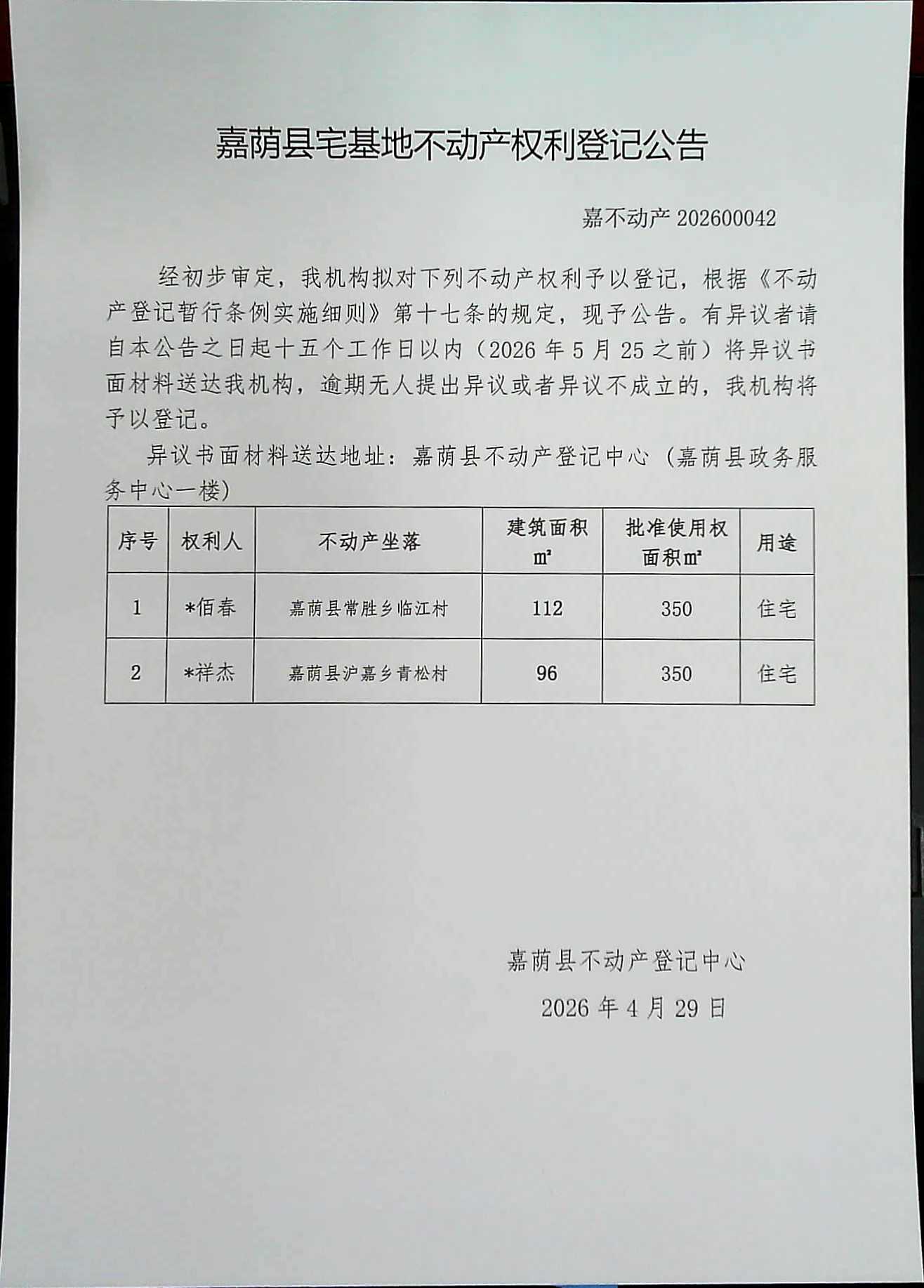 嘉荫县宅基地不动产权利登记公告 嘉不动产202600042