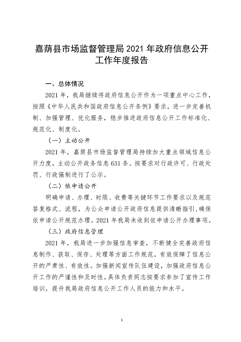 嘉荫县市场监督管理局2021年政府信息公开工作年度报告